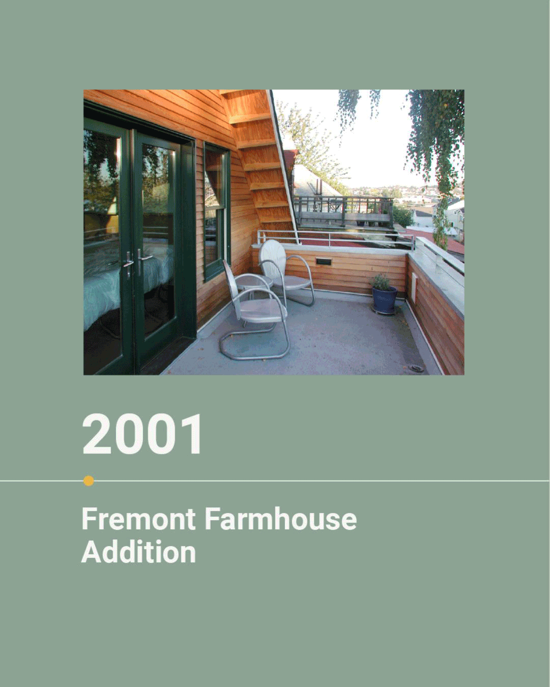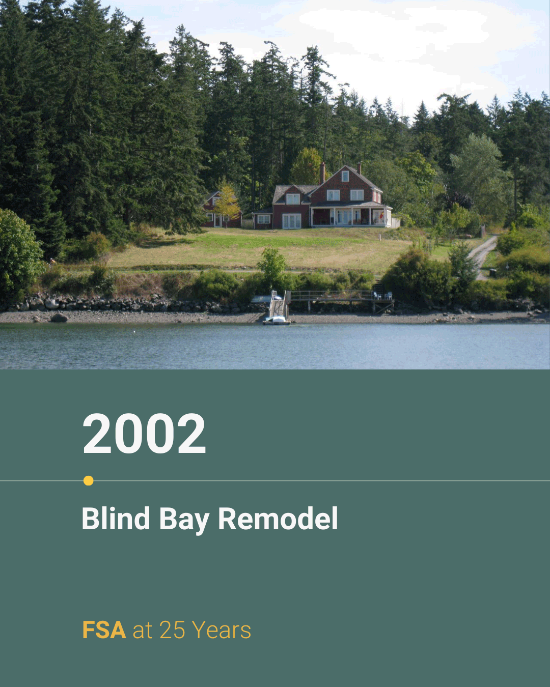 Rewinding to year 4 of 25: 2002. Reflecting on our rehabilitation of a 1903 farmhouse on a 2 ½ acre residential compound in Blind Bay, Shaw Island. The original house was moved from Bainbridge Island to Shaw by boat in the 1940s. This remodel holds a special place in our hearts as it not only marked a milestone for our young firm due to its historical value, unique location, and scope but also served as the site where Richard and Allison exchanged their vows.