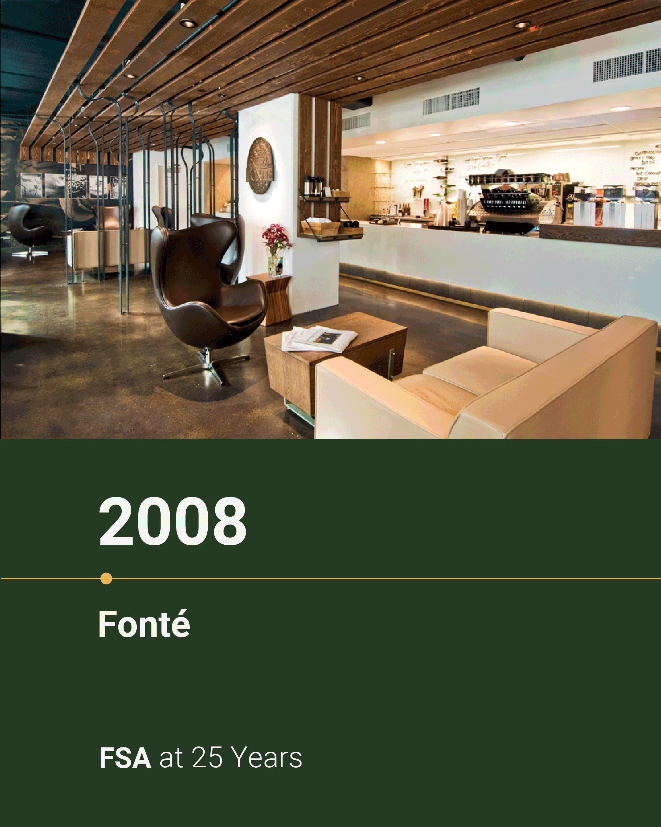 Rewinding to year 10 of 25: 2008. The year we designed Fonté’s flagship store at the base of the Four Seasons Hotel in downtown Seattle. Despite the empty space’s low ceilings, exposed piping, and limited natural light, we saw potential.