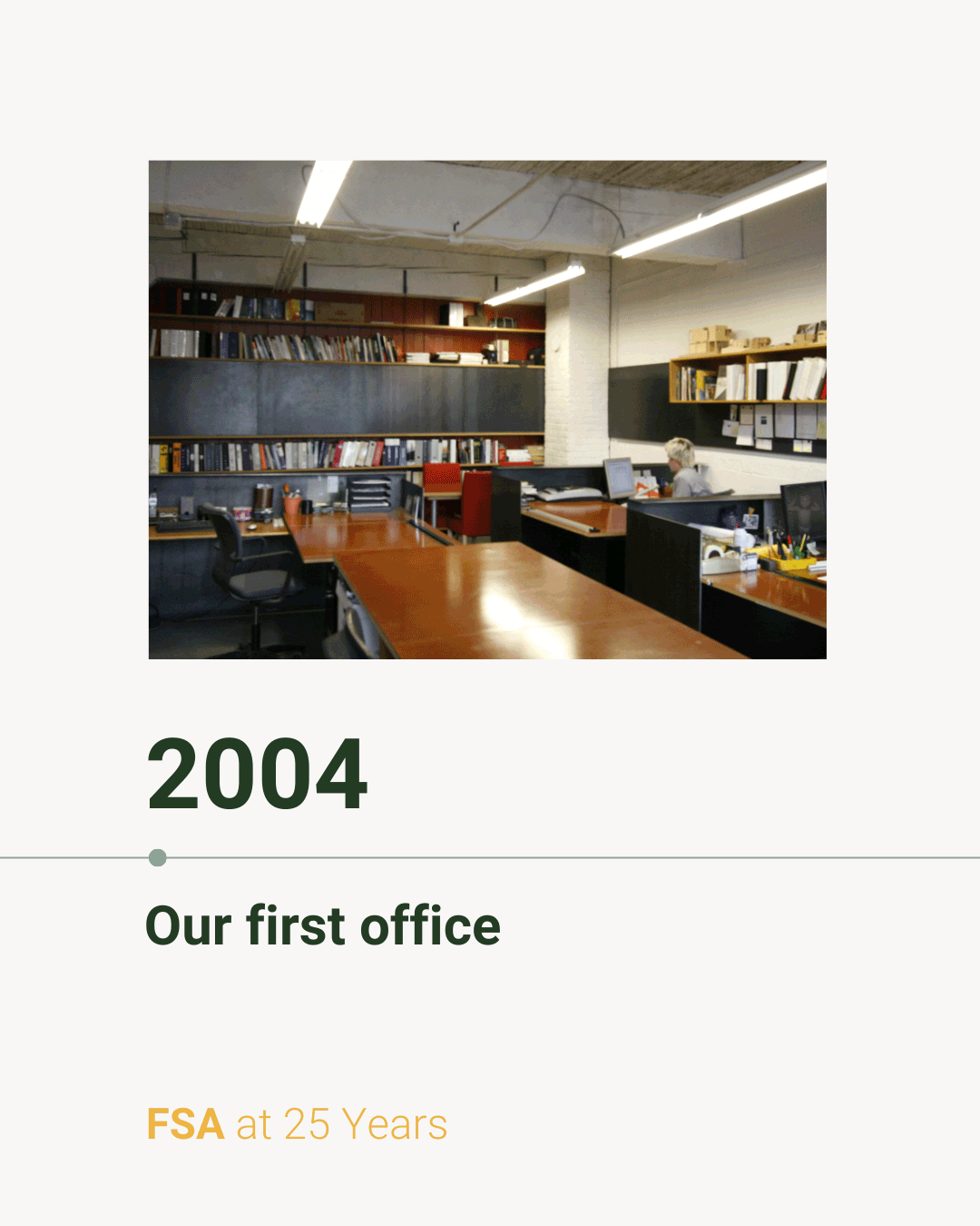 Rewinding to year 6 of 25: 2004. We moved into our first office in the 1910 Weleno Cork Insulation building in Seattle’s SODO neighborhood. Inspired by the building’s industrial past, we designed and built all of the furniture in the space, including the bent metal plate desks and sliding steel panel storage. We also officially welcomed Allison to the team after years offering input behind the scenes.