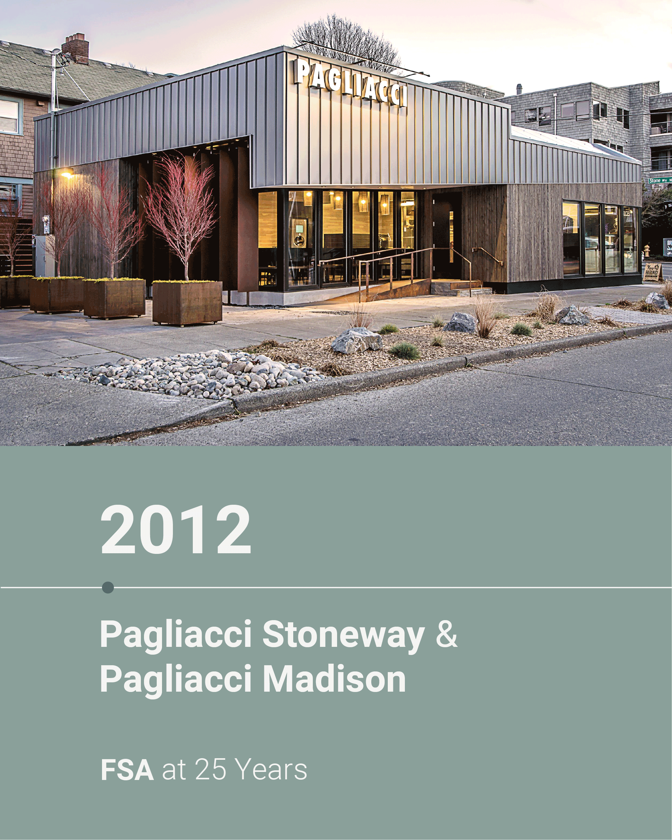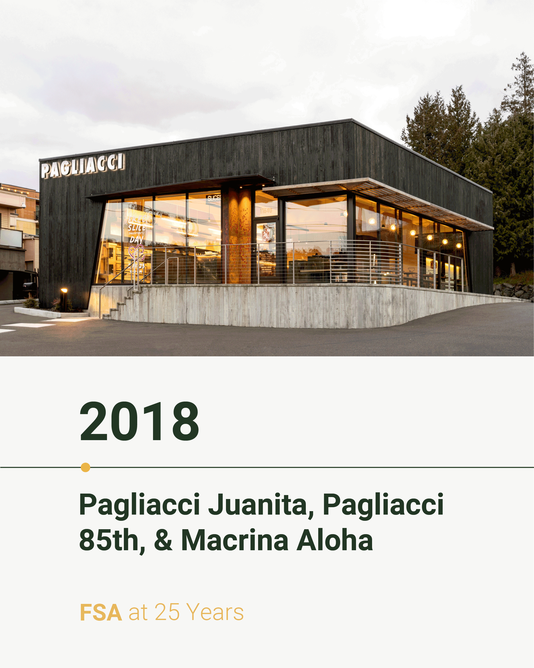 And that brings us to 2024—our 25th year as an architecture firm! This year, we completed two projects for our friends at Pagliacci Pizza, including the construction of the new Eastgate location and remodel of the Edmonds location.