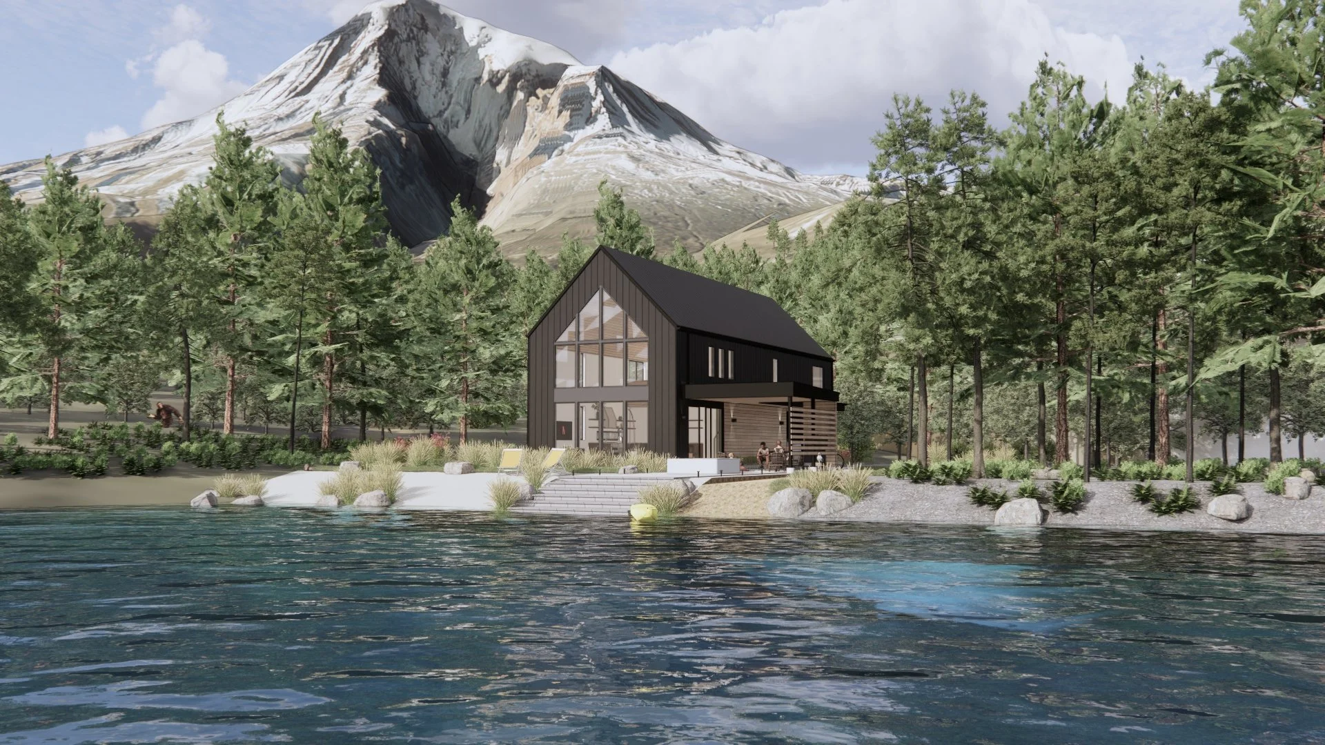 A modern cabin in the woods. After a successful partnership designing and building the Getaway Cabin, our clients, Columbia Creek Group, approached us about designing a slightly larger modern family cabin. A two story, 2000 SF retreat, the home has three full bedrooms and a sleeping loft with twin beds. Guests drive up to the covered porte-cochere, step up to the protected front door and into an entry with ample ski and boot storage. A classic galley kitchen lines the vaulted living and dining space. A wall of glass fronts the view connecting inside and out. A covered patio space offers a dry and shaded spot to hang out outside.