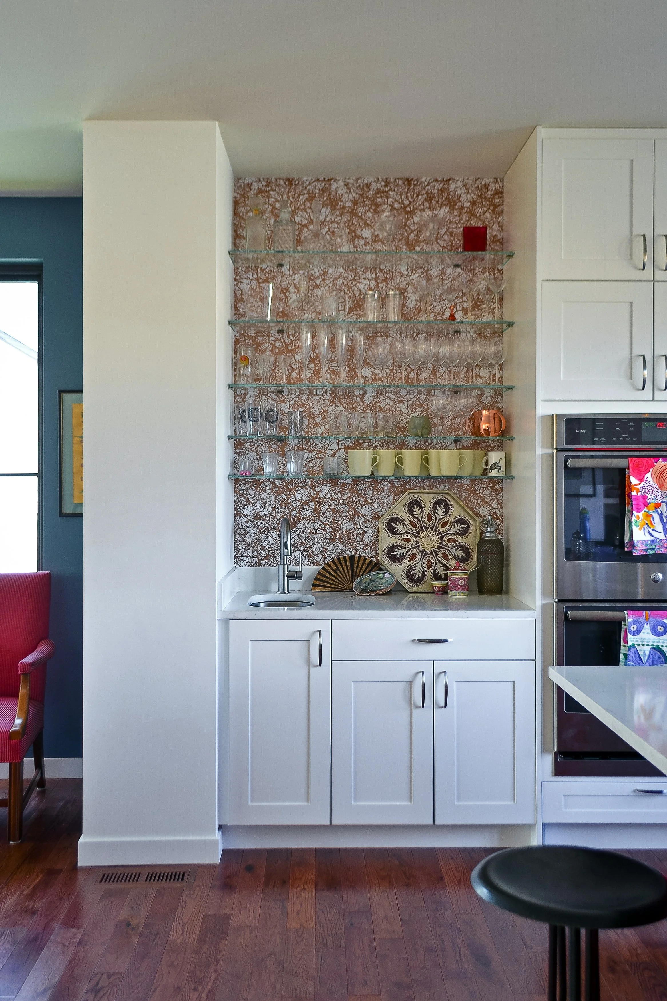 These were the driving priorities behind this whole home rebuild and second floor addition for a family of four. Each space has a purpose designed to accommodate daily life: from the alcove for puzzling and reading to the walls showcasing the client’s artwork to the open kitchen designed for cooking, baking and entertaining. Each family antique and heirloom inhabits a space specifically designed for its use. Each room is a canvas for the clients, infinitely creative people, to furnish and tailor to create functional, vibrant spaces for their family.