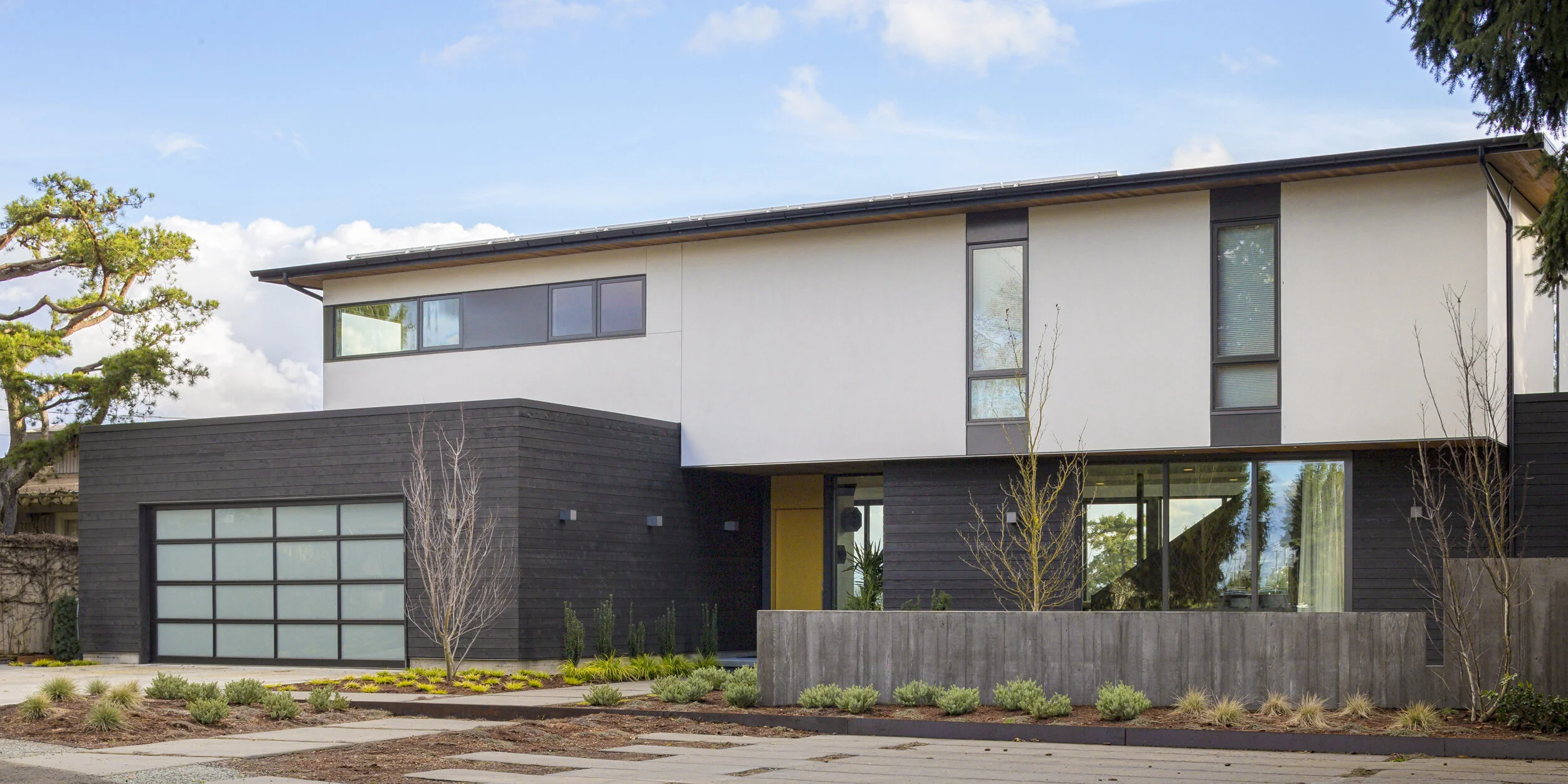 The main floor is clad in black wood siding while the cantilevering upper floor is covered with white stucco. The two tone dichotomy was intended to emphasize the home’s horizontality and minimize its street-side scale. That dichotomy continues into the building interior, where the main floor's open spaces are grounded in darker finishes while the upper floor bedrooms are kept light. Clerestory windows, skylights and interior glass panels bring additional light into rooms where privacy is needed. The project has several energy efficient features including an electric vehicle charging station, solar panels, and radiant heating.
