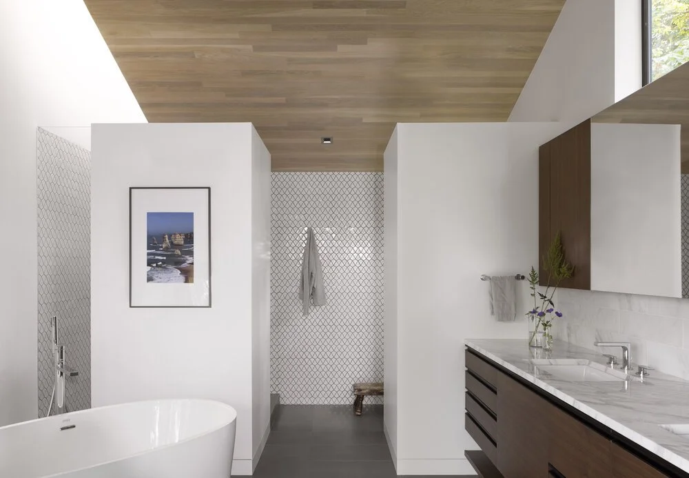Upstairs, the master suite was reconfigured for daylighting, a new walk-in closet and ensuite bath. The old master bathroom was reworked and enlarged with an addition. The new bath now spills out onto a west facing deck and territorial views of the trees can be seen from the enlarged bath entrance. The room’s free-standing tub and south facing vanity for two is separated by a pair of part height walls that allow light to spill over into a private walk-in shower area that is topped by a skylight and toilet room.