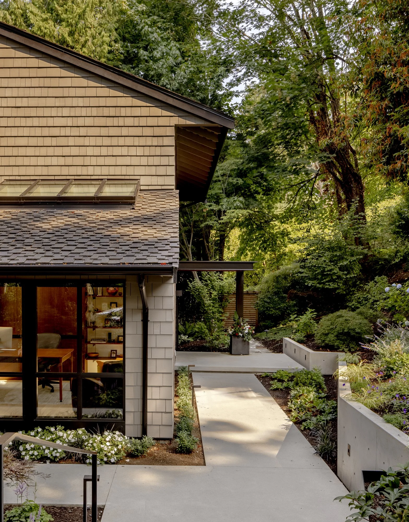 Starting at the entry, new hardscaping, steel planters and angled landscape walls guide guests through the tree filled property to the front door. A new raised concrete porch marks the formerly hard-to-find entrance. A steel and wood canopy provides lighting and protection from the rain. Thoughtfully placed landscaping areas buffer the home and offer privacy to the spaces inside.